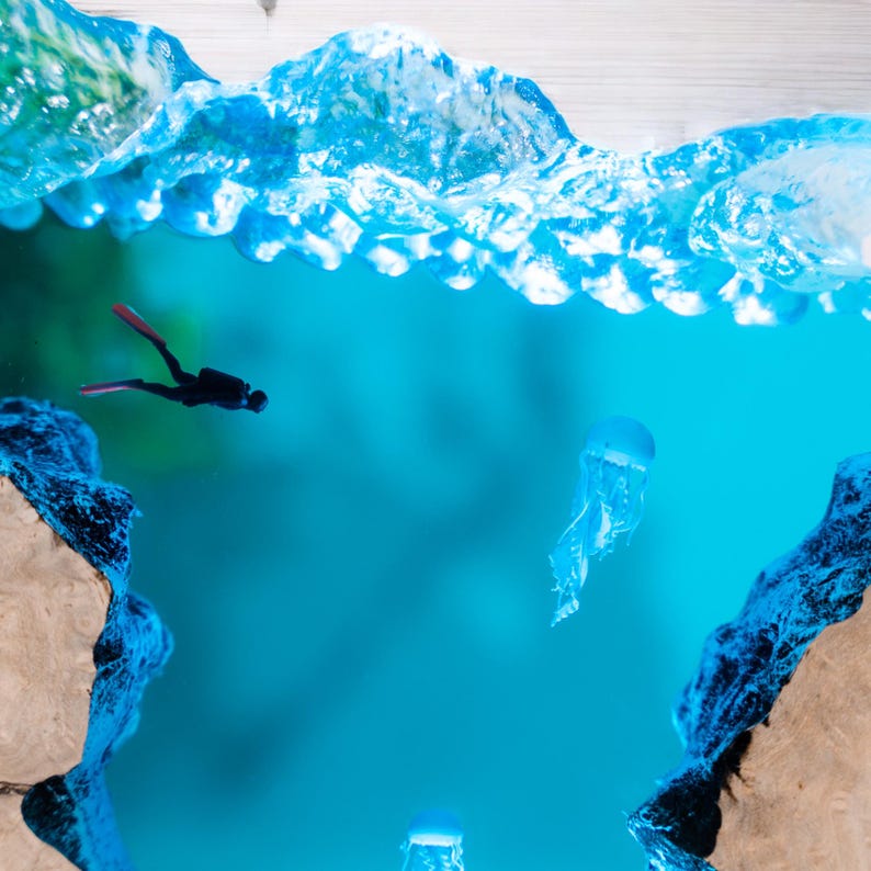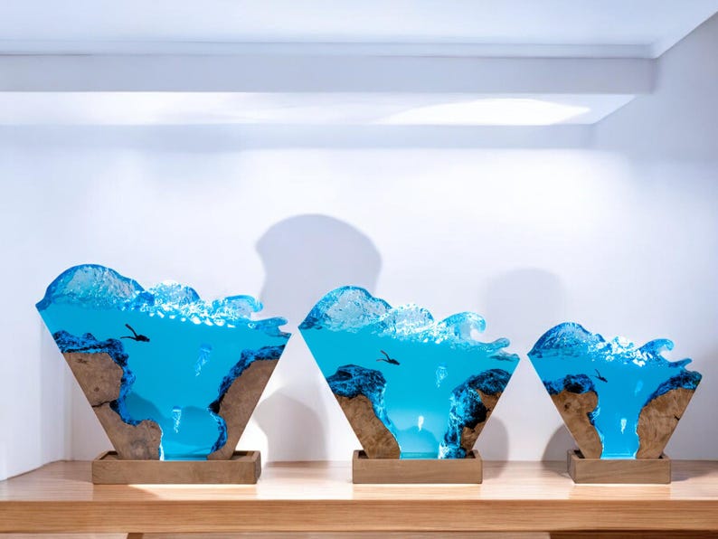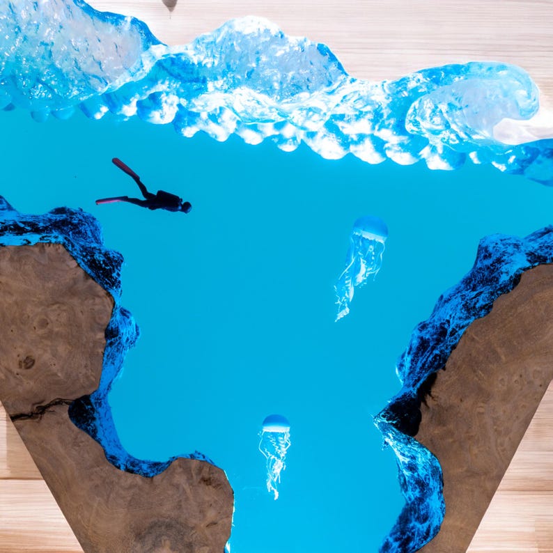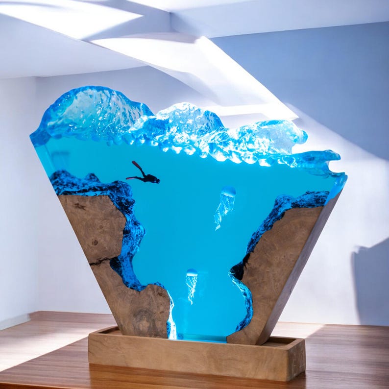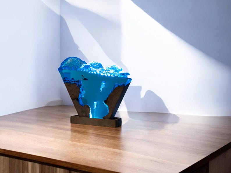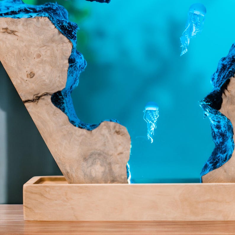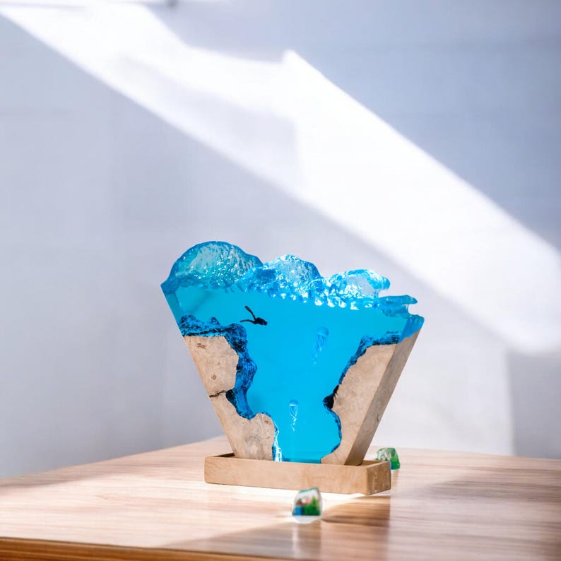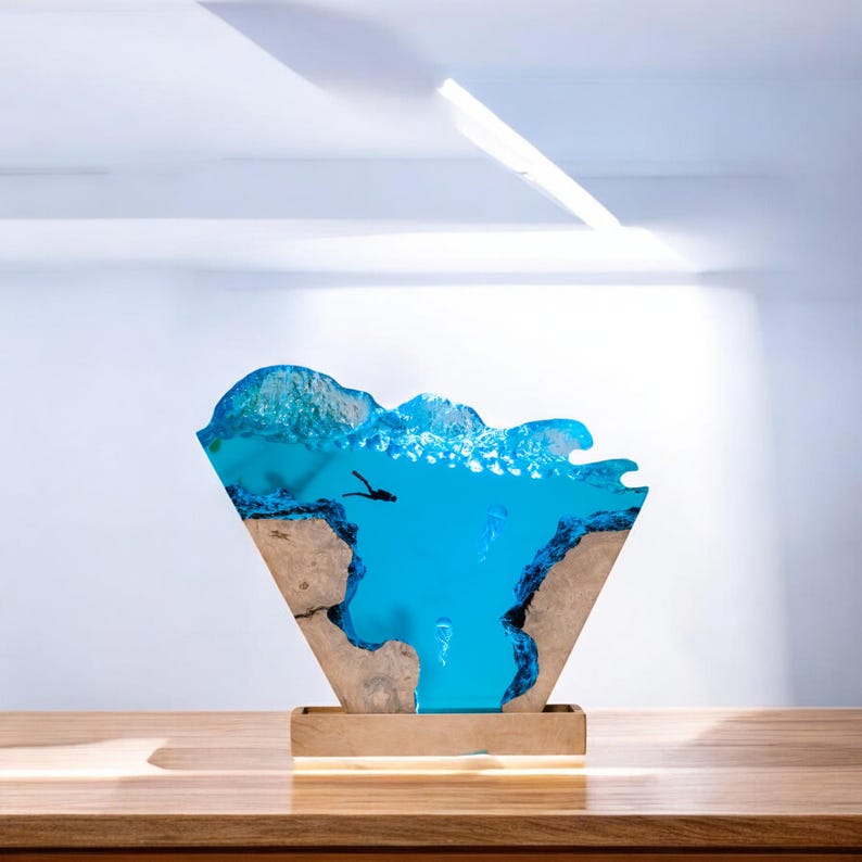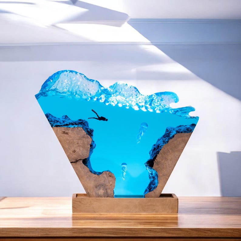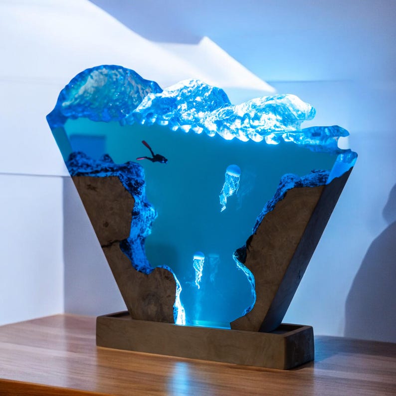 Imagine the tranquility of the deep blue sea encapsulated in a mesmerizing piece of art - the Jellyfish & Diver Resin Epoxy Lamp. This exquisite lamp is a stunning blend of craftsmanship and creativity, combining the natural beauty of wood with the luminous charm of epoxy resin. Whether it adorns your bedside table, nightstand, or any space in your home, this custom resin lamp will illuminate your surroundings with a soft, ambient glow, perfect for creating a cozy atmosphere.
