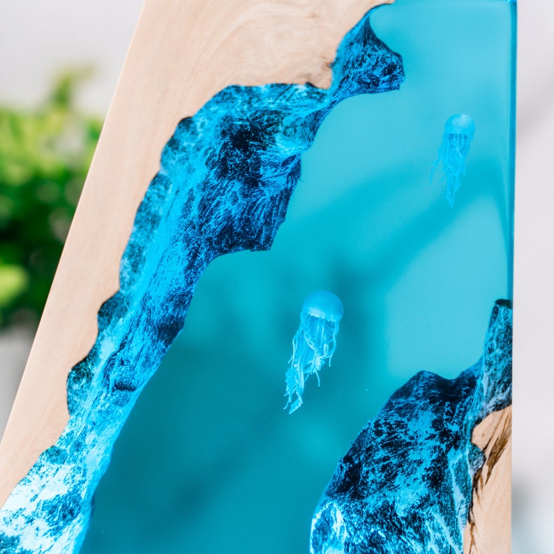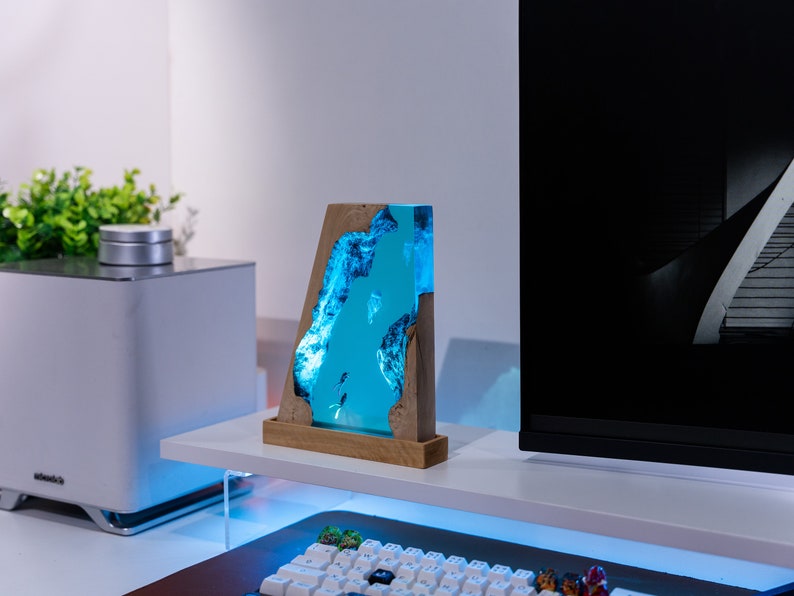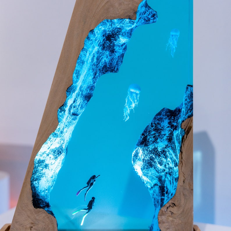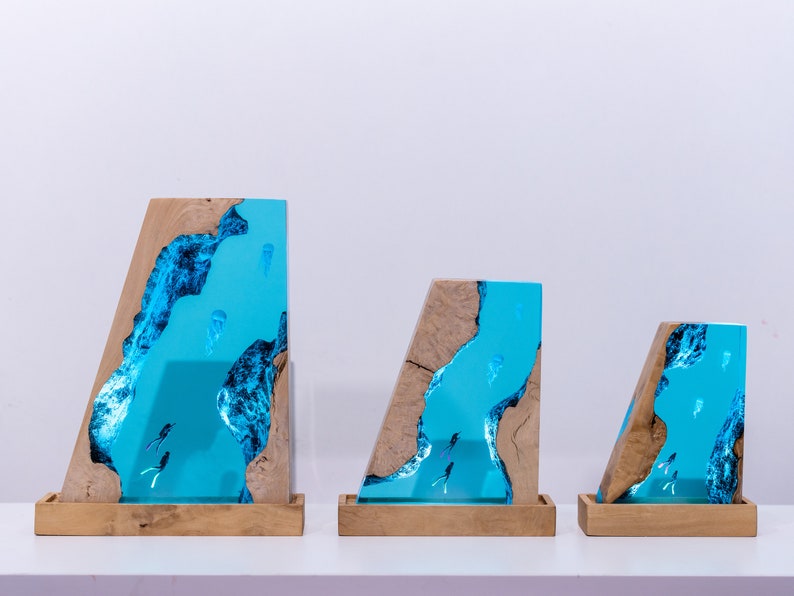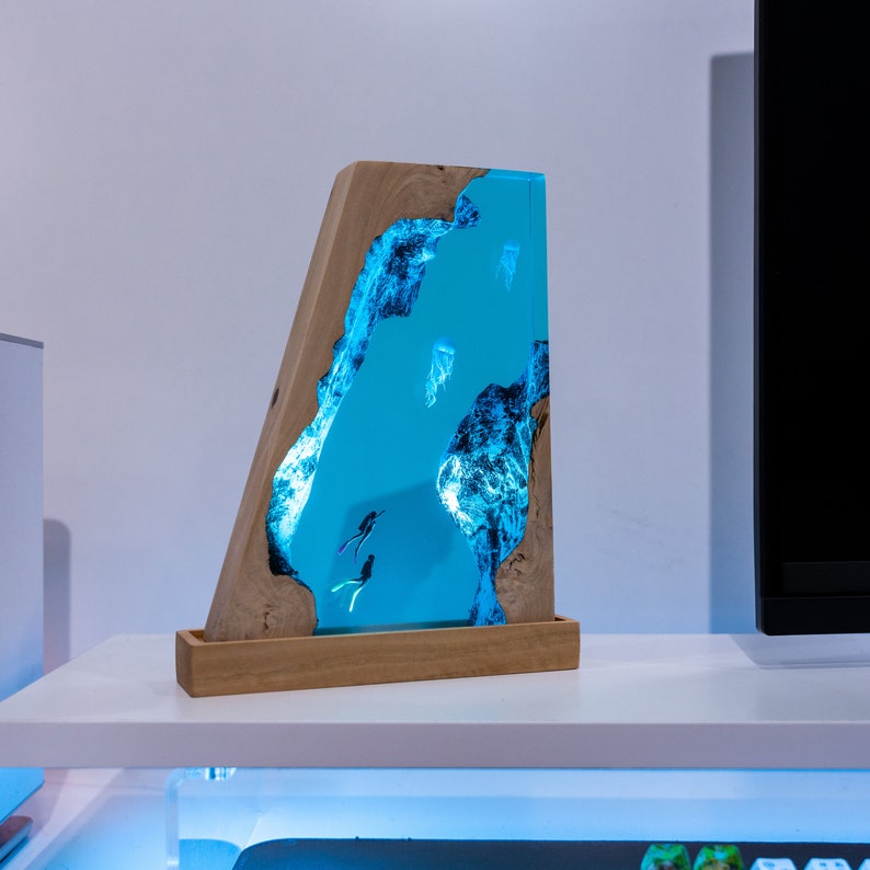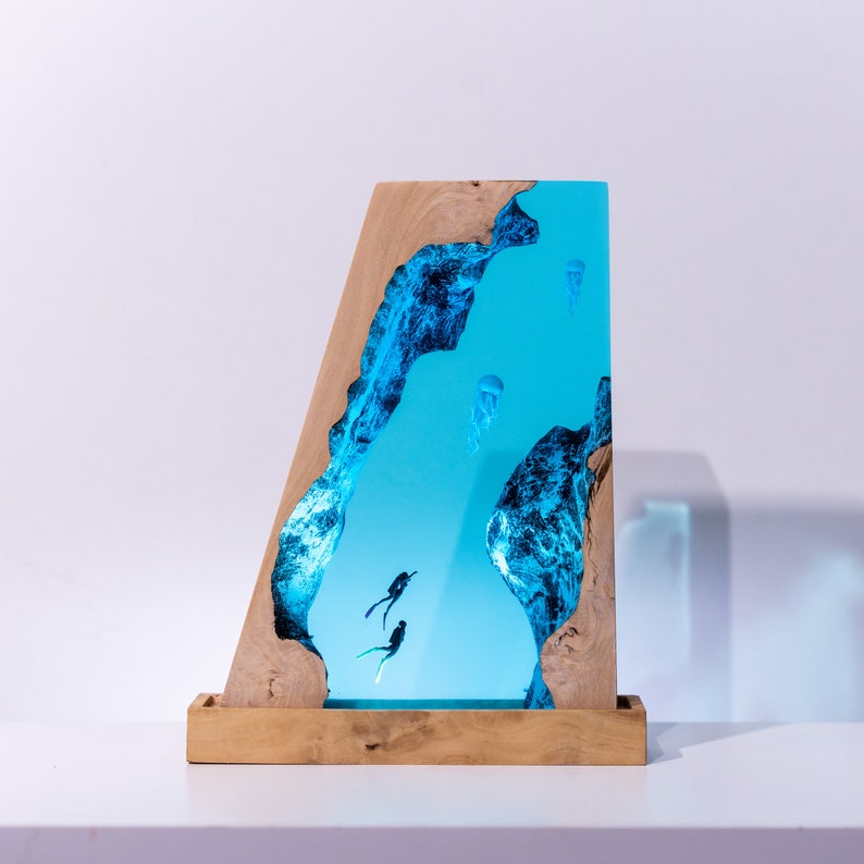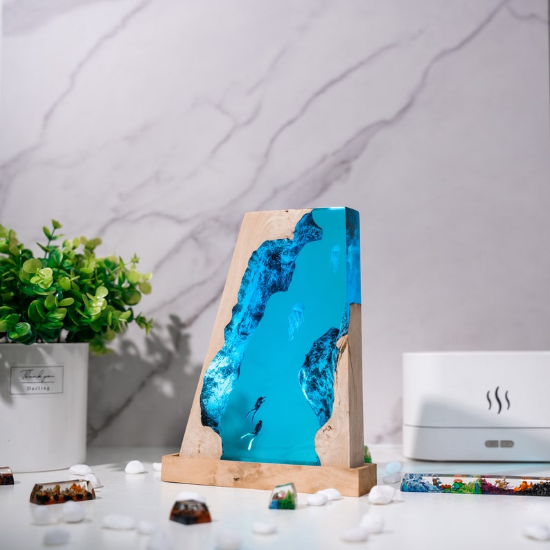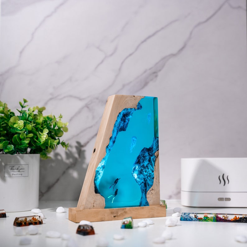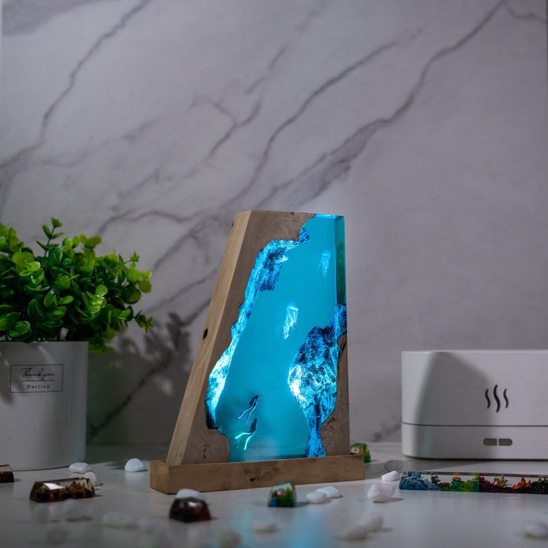 Transform your living space with our enchanting night light scuba diver ocean lamp, a stunning piece that captures the beauty of underwater adventures. This exquisite lamp features a detailed scuba diver surrounded by vibrant marine life, all crafted with high-quality epoxy resin wood to create a mesmerizing effect when illuminated.