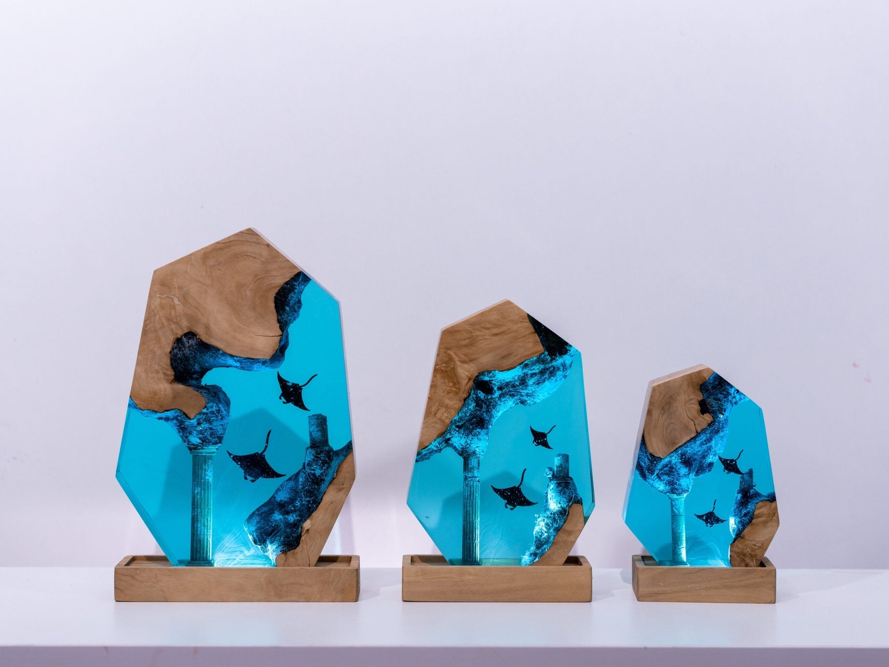 Imagine manta rays suspended in resin, nature and craft intertwined, a portal to depths unknown.