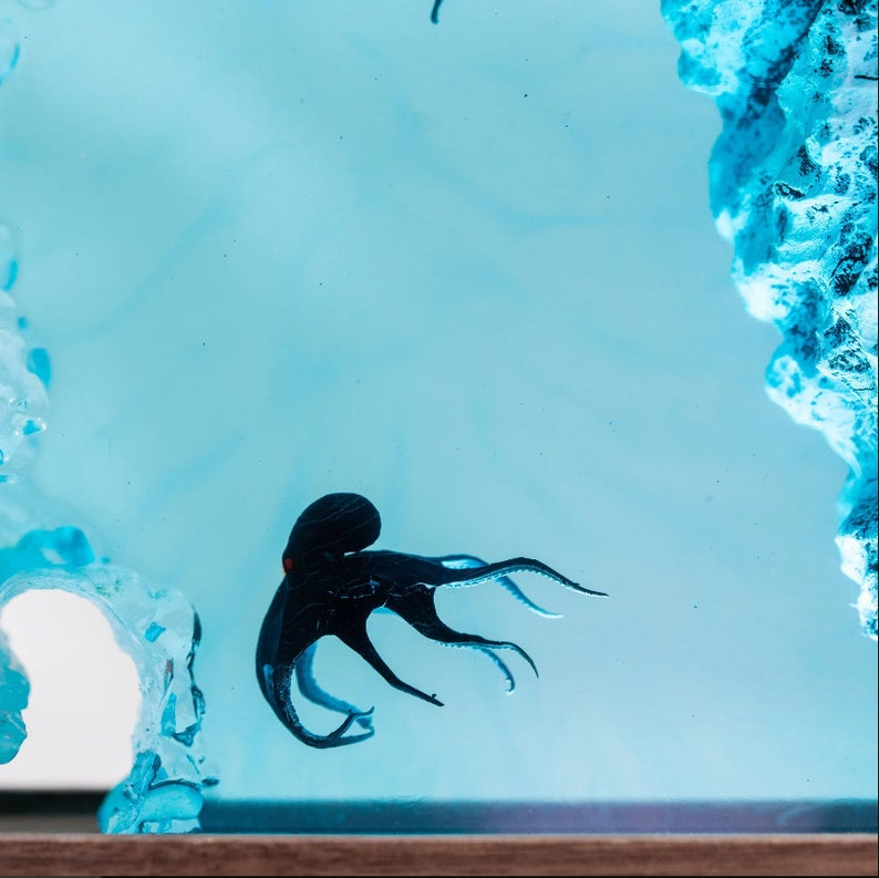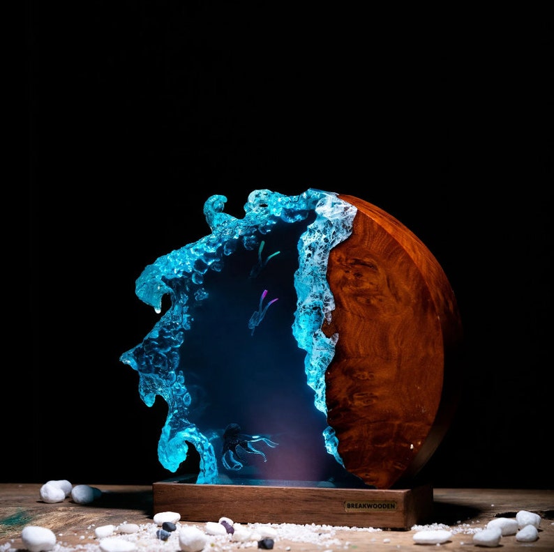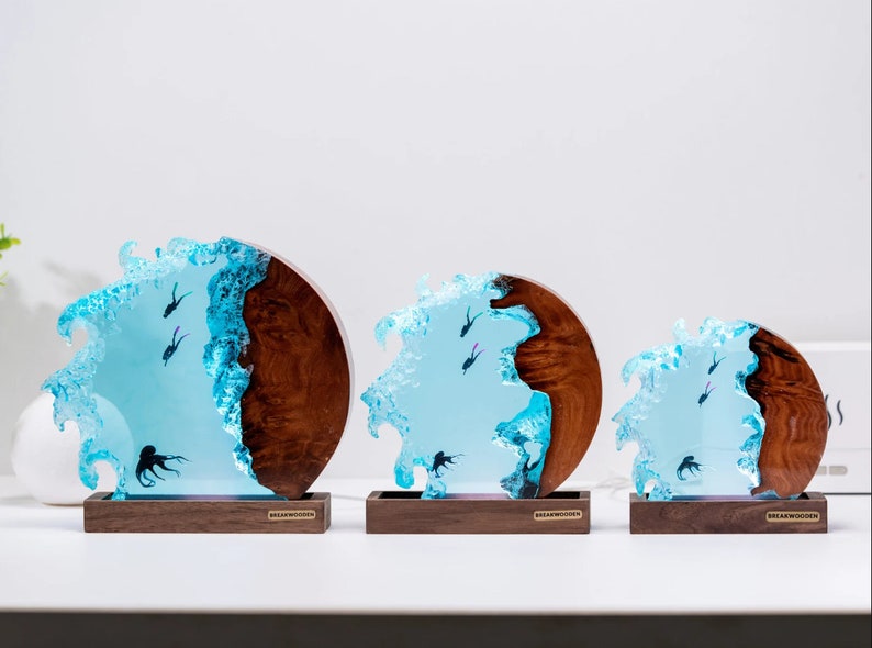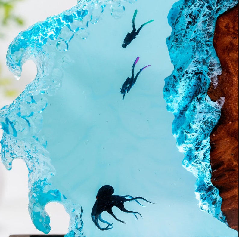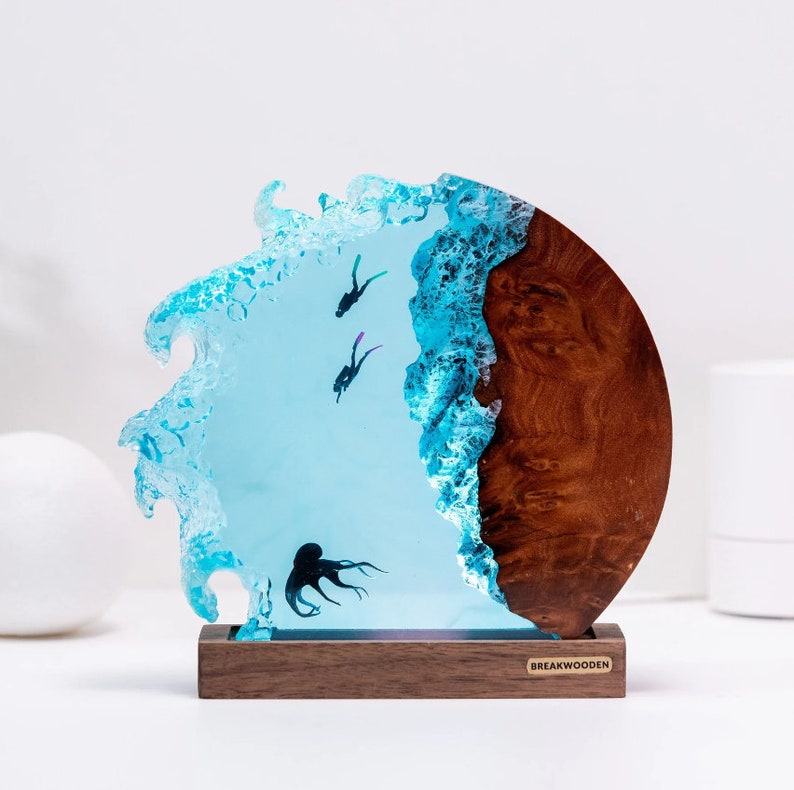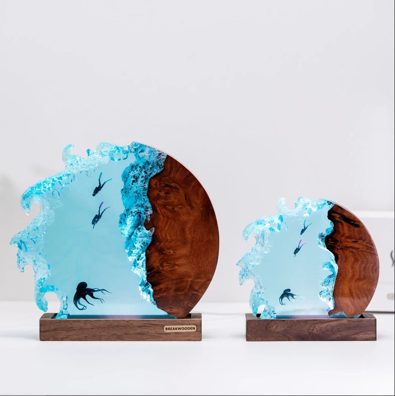 Immerse your space in the enchanting depths of the sea with our Night Light scuba diver ocean themed Octopus lamp crafted from premium resin. This custom epoxy lamp captures the essence of the ocean with its intricate details and captivating design. The combination of epoxy resin and wood creates a unique piece that exudes art deco charm, making it a perfect addition to your home decor or a thoughtful gift for any occasion.