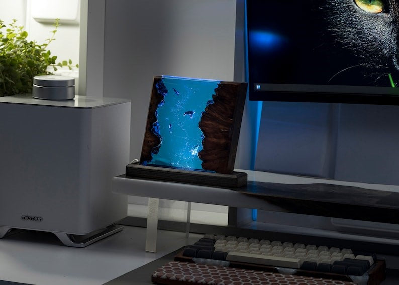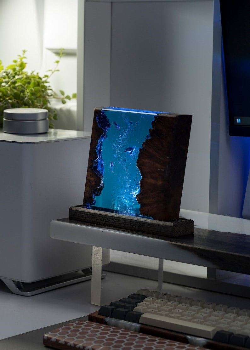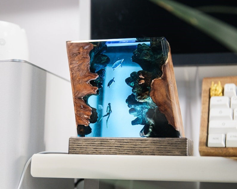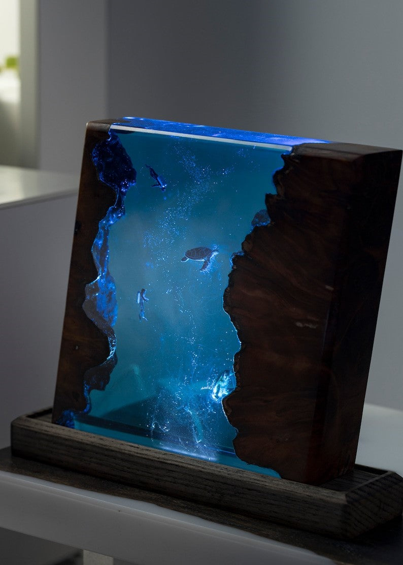 The lamp is not just a visual delight but also a source of warm, ambient light. The epoxy resin is carefully shaped to create a gentle curve, diffusing the light in a way that mimics the play of sunlight through water. Whether used as a bedside lamp, a living room centerpiece, or a unique addition to your workspace, the lamp adds a touch of magic to any environment.