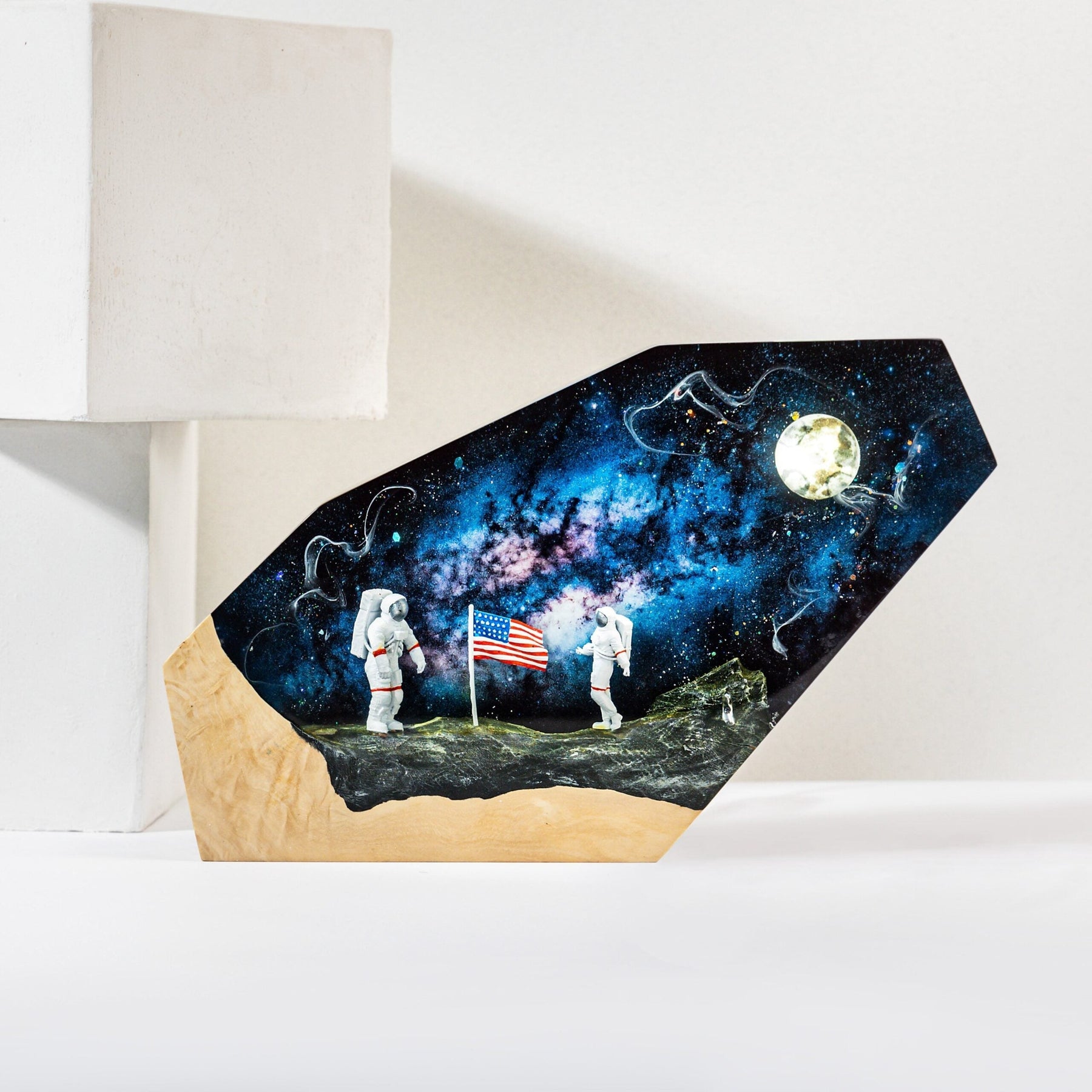 Embark on a mesmerizing journey as you gaze into the depths of this enchanting lamp. Suspended in a galaxy of epoxy resin, miniature astronauts float weightlessly, exploring the mysteries of interstellar space. Their presence sparks wonder and ignites your imagination, as if you’ve joined them on their cosmic odyssey.