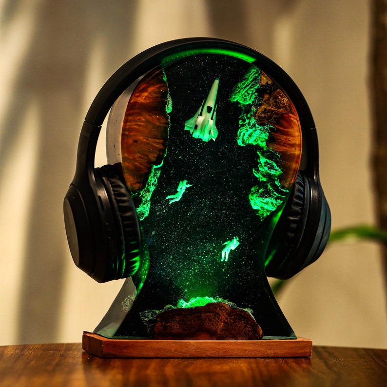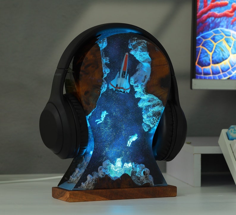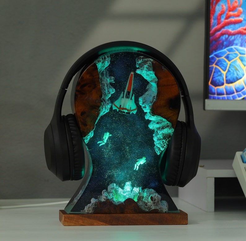 Introducing our stunning Galaxy Night Light and Headphone Stand, a mesmerizing blend of natural wood and captivating resin art. This unique combination creates a functional and aesthetically pleasing piece that will elevate your space to new cosmic heights.
