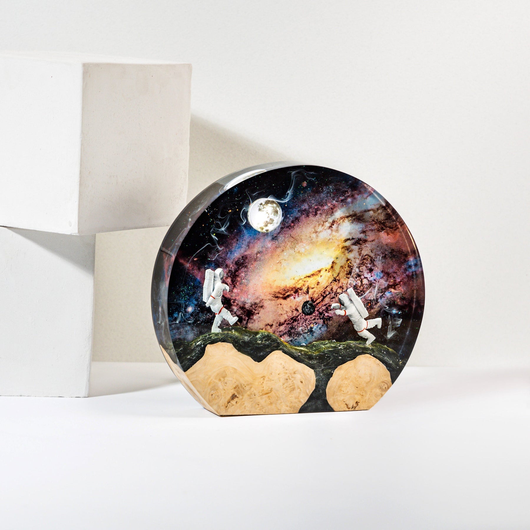 Embark on a mesmerizing journey as you gaze into the depths of this enchanting lamp. Suspended in a galaxy of epoxy resin, miniature astronauts float weightlessly, exploring the mysteries of interstellar space. Their presence sparks wonder and ignites your imagination, as if you’ve joined them on their cosmic odyssey.