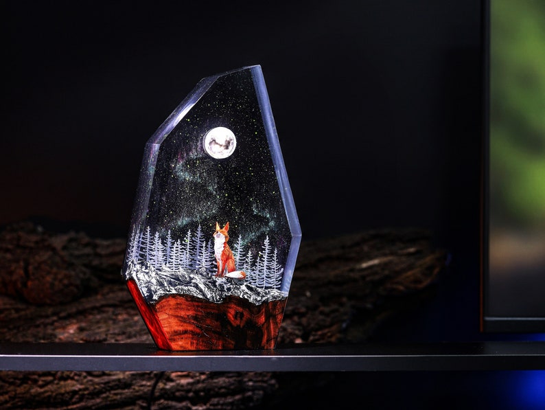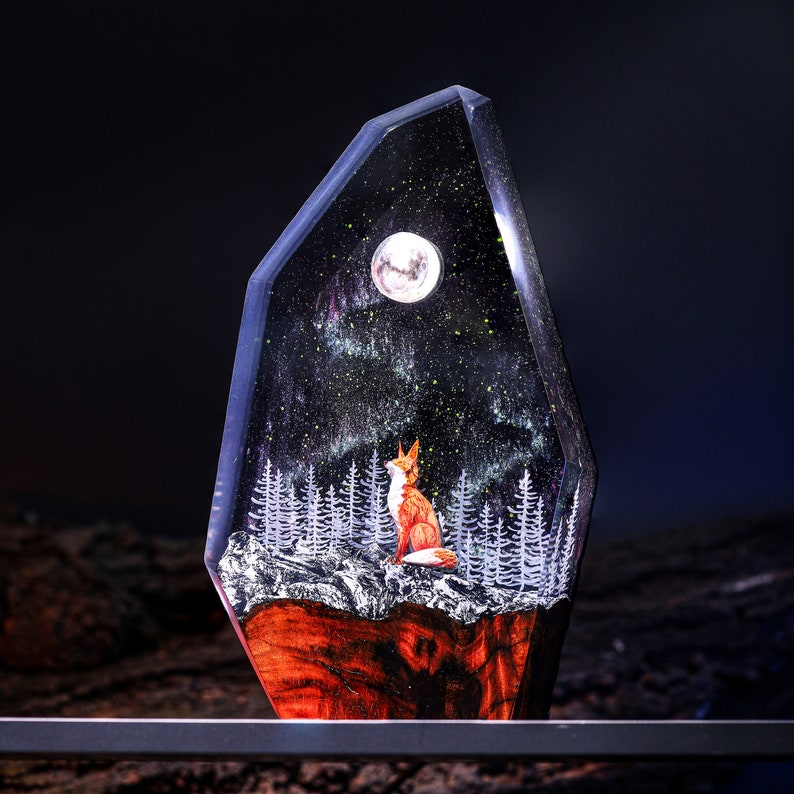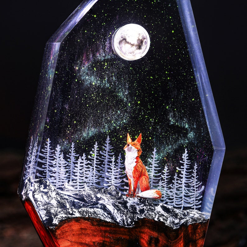 I hope these sentences effectively capture the essence of your resin lamp with the aurora lights and wolf theme. If you need any further assistance, feel free to ask!