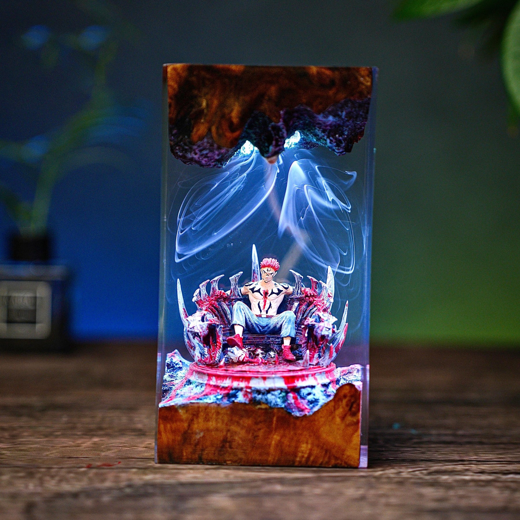 Step into a world of cursed energy and ancient power with this Handmade Cursed Spirit Resin Lamp. Meticulously crafted from epoxy resin and natural wood, this night light captures a dramatic scene featuring a powerful figure shrouded in red and black aura. Itโs the ultimate display piece for anime lovers, fantasy fans, or anyone drawn to bold, mysterious aesthetics.