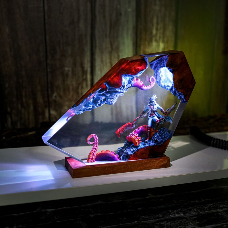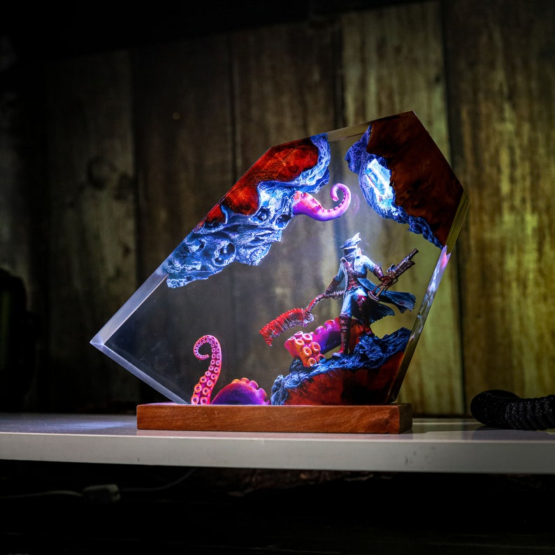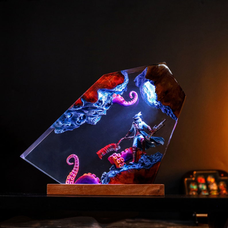 This handcrafted lamp, inspired by the iconic Bloodborne game, is a perfect blend of gothic elegance and functional design. Crafted from durable wood and resin, it features intricate details like the Hunter's emblem and the eerie glow of the lamp's light.