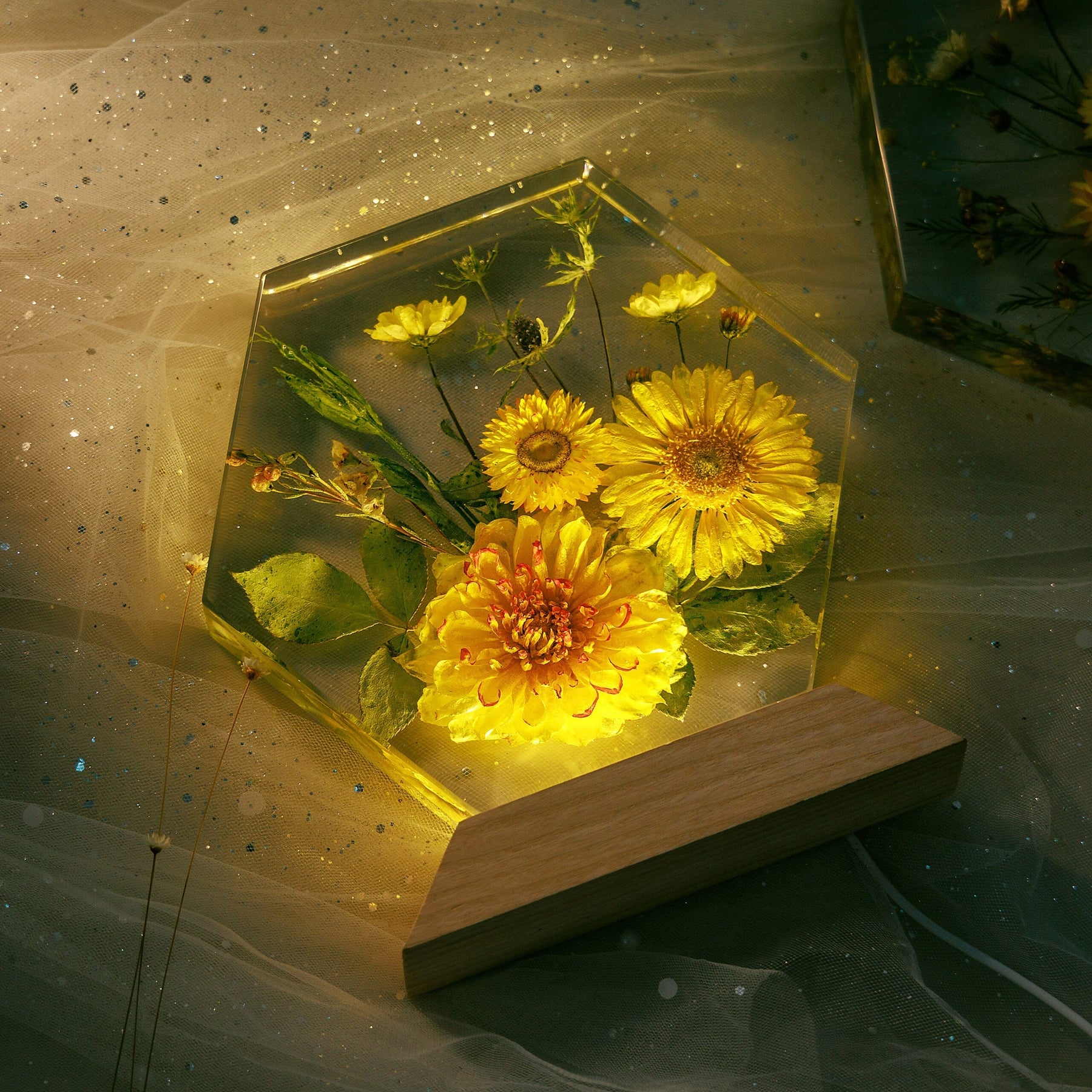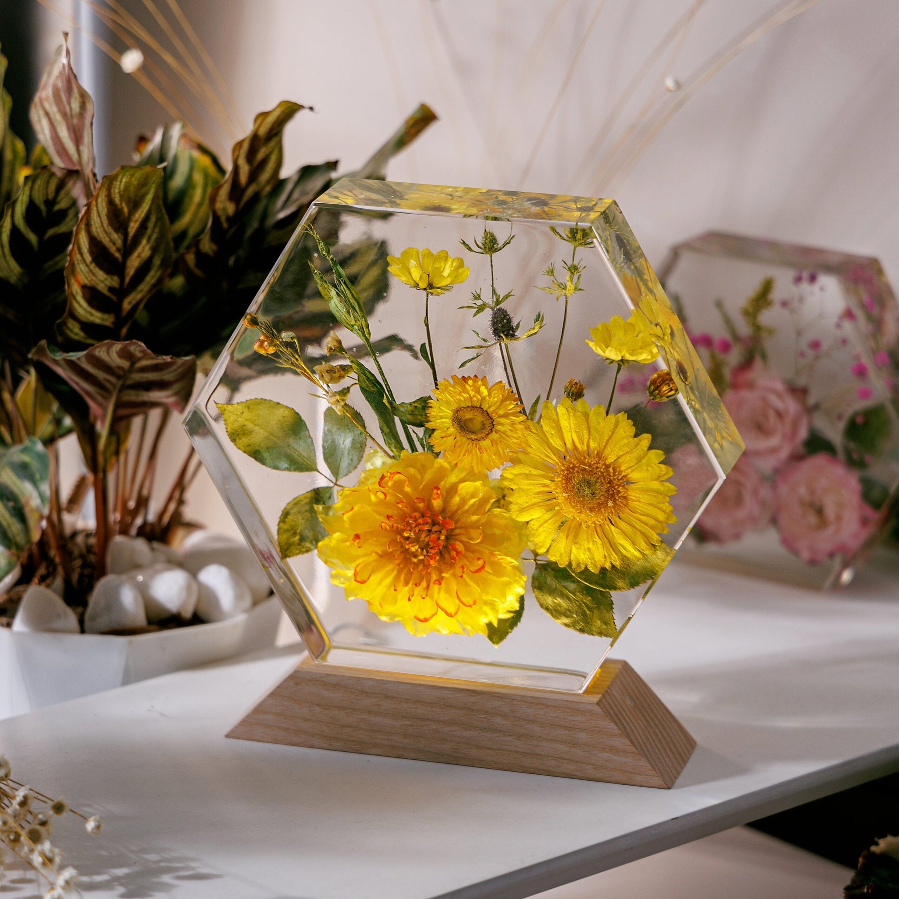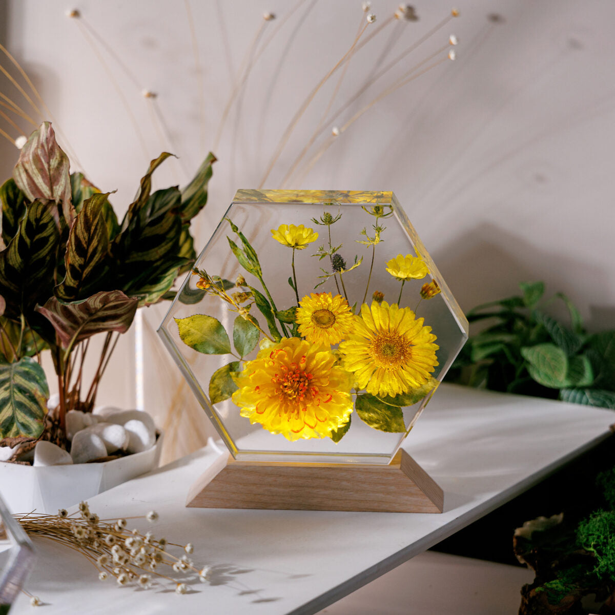 The Golden Daisy Flower Resin Lamp can be seen as a captivating tribute to the enduring beauty of dried flowers. While it is not composed of actual dried flowers, its design reflects the intricate and delicate nature of these preserved blooms. Dried flowers are often cherished for their ability to capture the essence of the natural world long after they’ve faded, and the lamp captures this essence through its resin design.