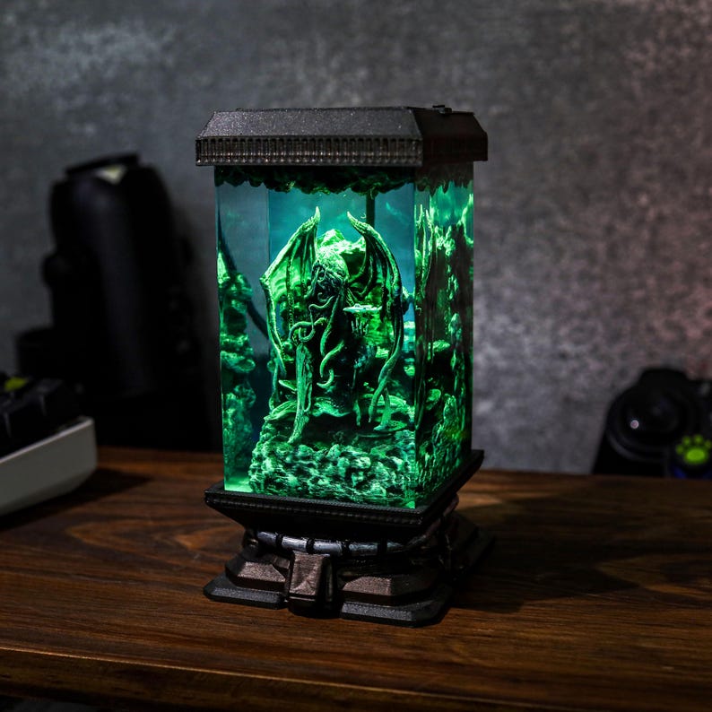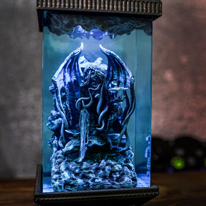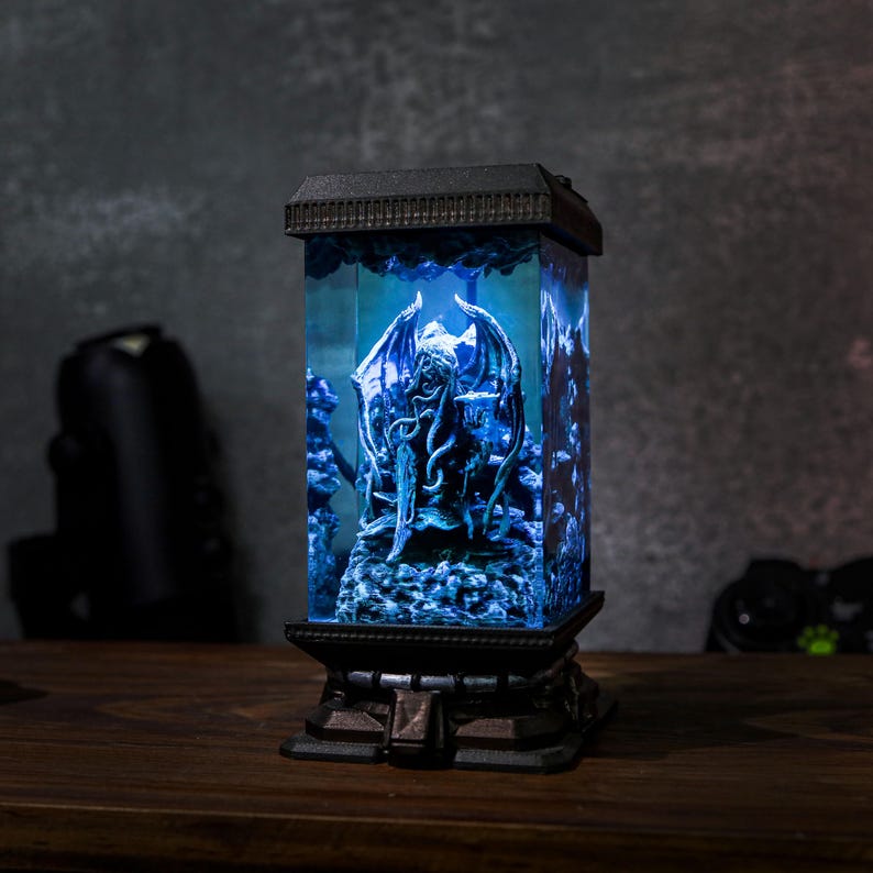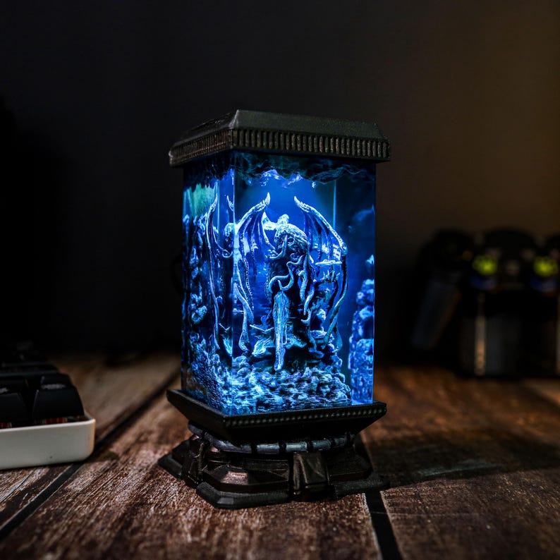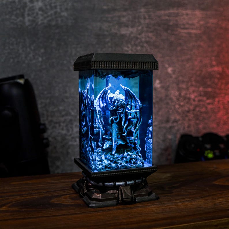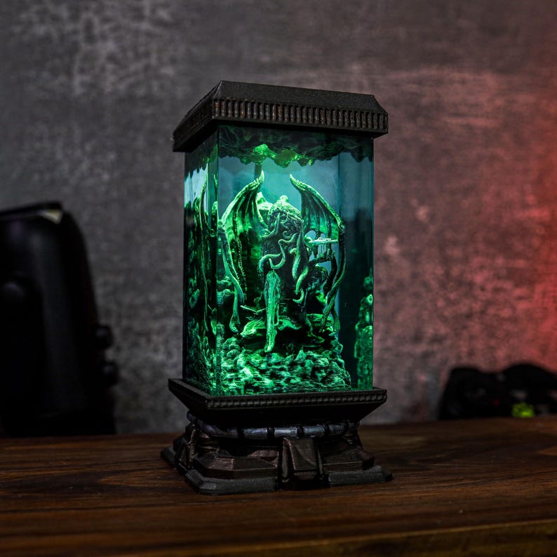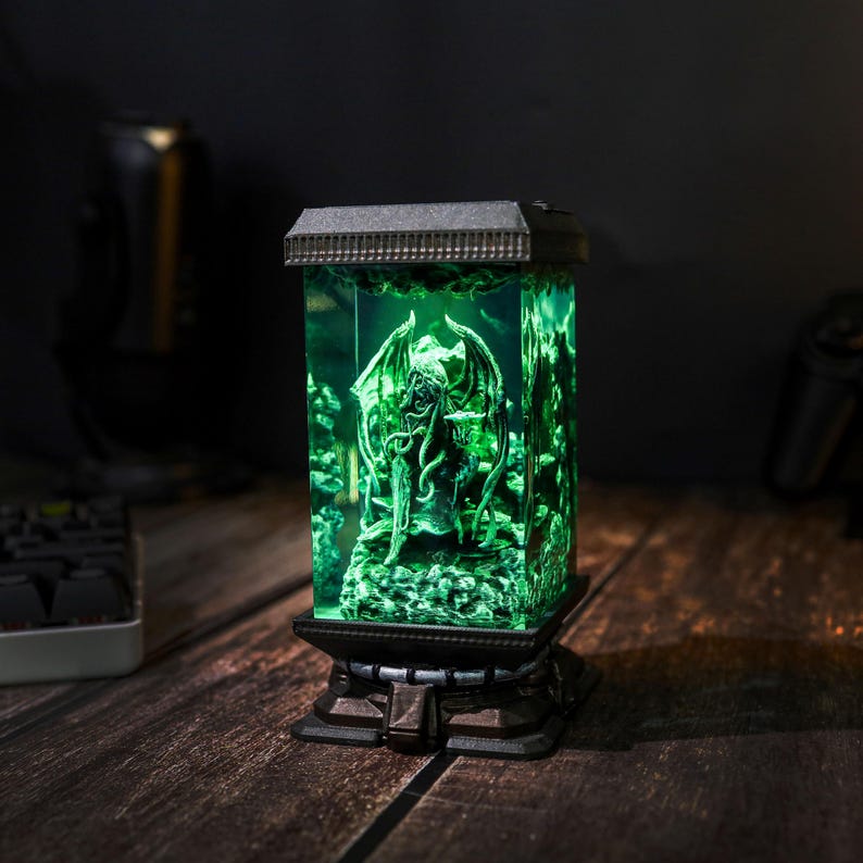 Step into a realm of dark fantasy with the handcrafted Cthulhu Resin Lamp. This mesmerizing lamp, inspired by the legendary cosmic creature, features captivating details of Cthulhu's haunting gaze and sprawling tentacles, frozen within a shimmering resin casing. Its oceanic tones and soft green glow create an enchanting, eerie ambiance—perfect for night lighting or as a conversation-starting display piece. Whether you’re a Lovecraft enthusiast or simply drawn to unique, atmospheric decor, this lamp offers a one-of-a-kind blend of art and mystery that will bring any room to life.