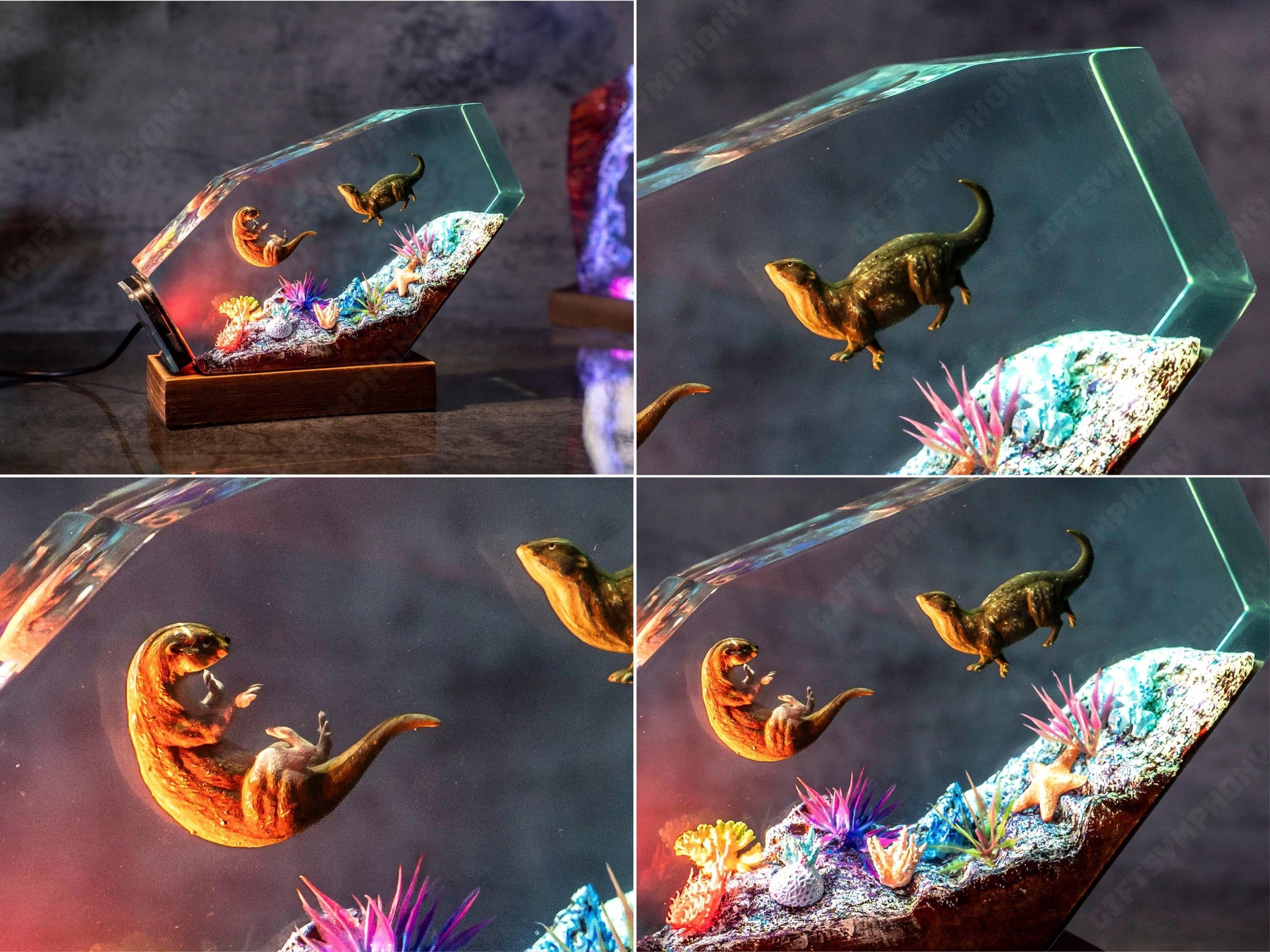 Discover the wonders of nature with the Otter Resin Night Lamp, a meticulously handcrafted piece that brings to life the vibrant and charming world of playful otters. The lamp is intricately designed, capturing the scene of two otters frolicking amidst colorful aquatic plants, creating a vivid and lively atmosphere. Every detail, from the otters to the water plants, has been carefully crafted to showcase natural beauty in a realistic and engaging way.