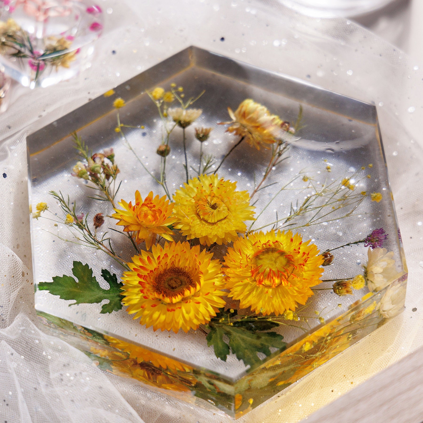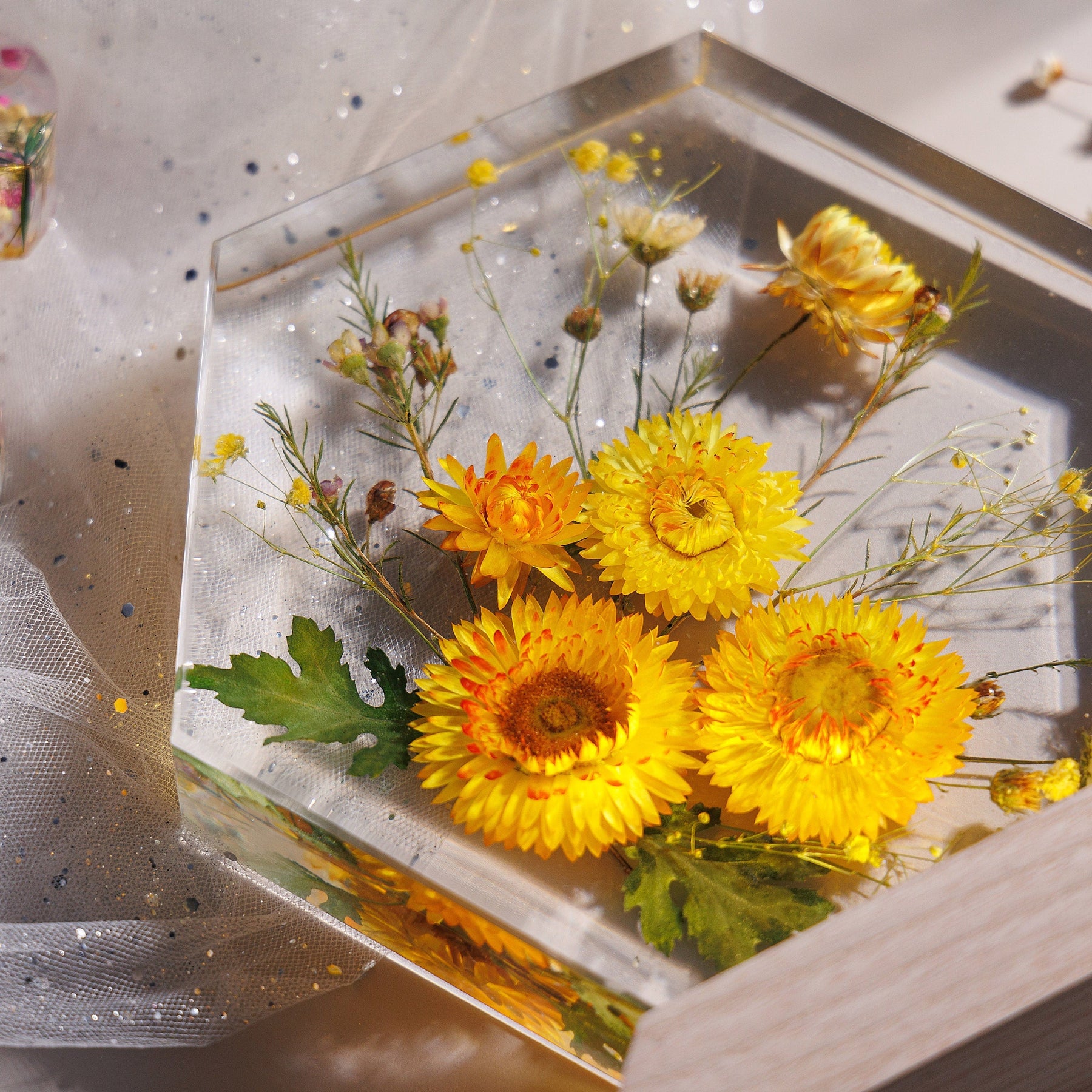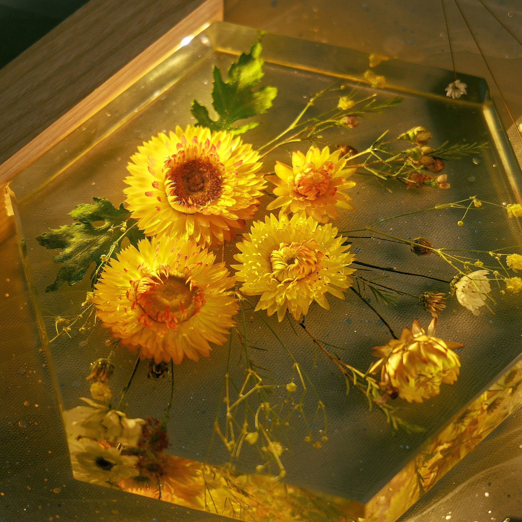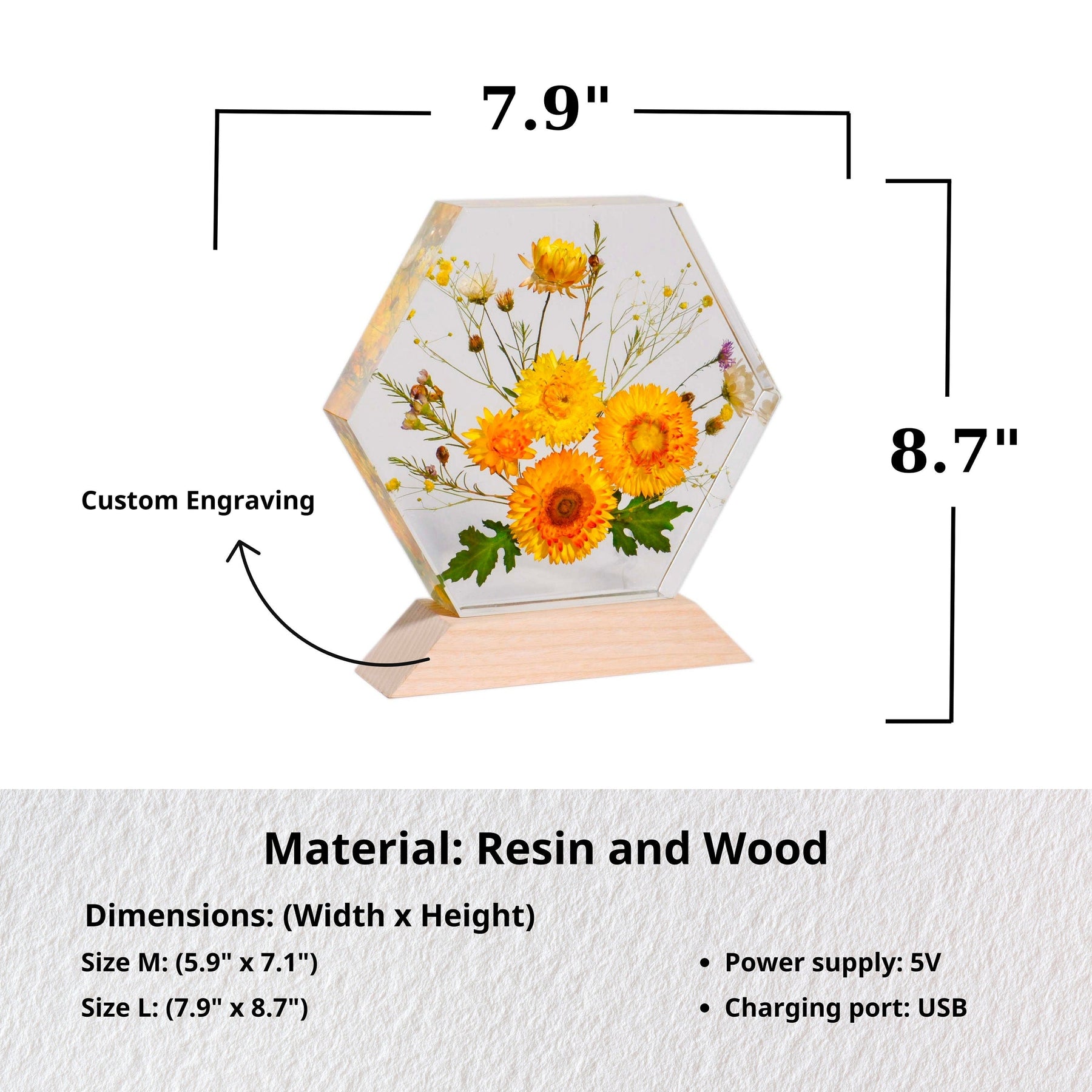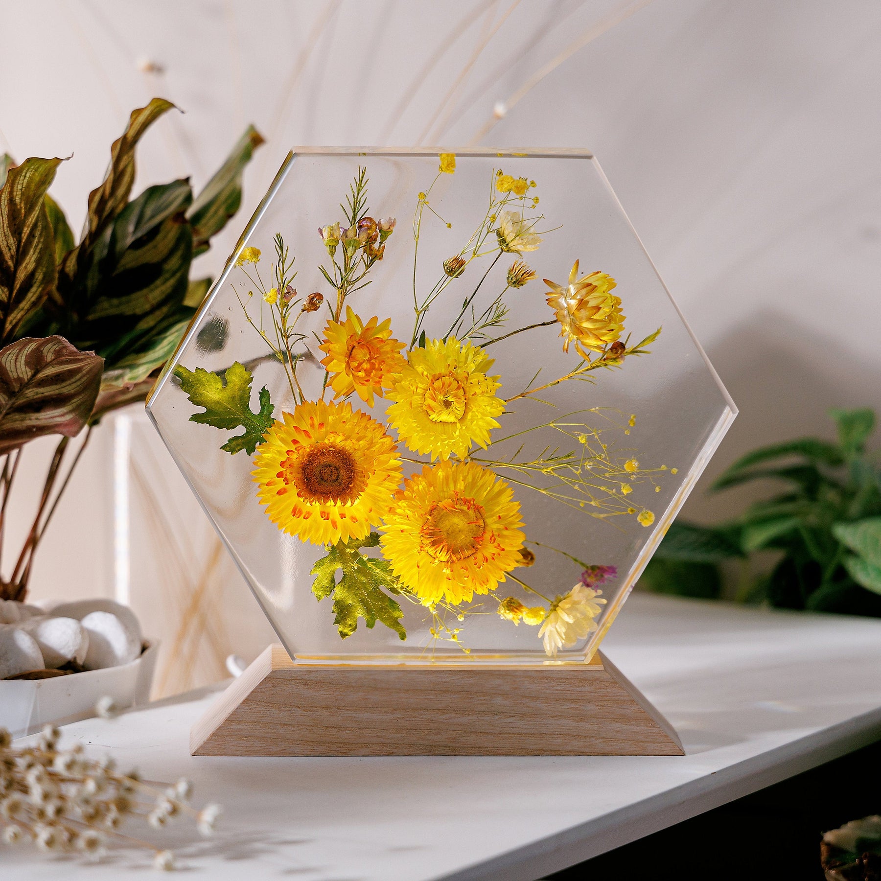 Handmade with precision, this night light wood lamp is not just a source of light but a statement piece that adds elegance to any space. The intricate details of the dried flowers preserved in resin make this lamp a standout piece of resin art.