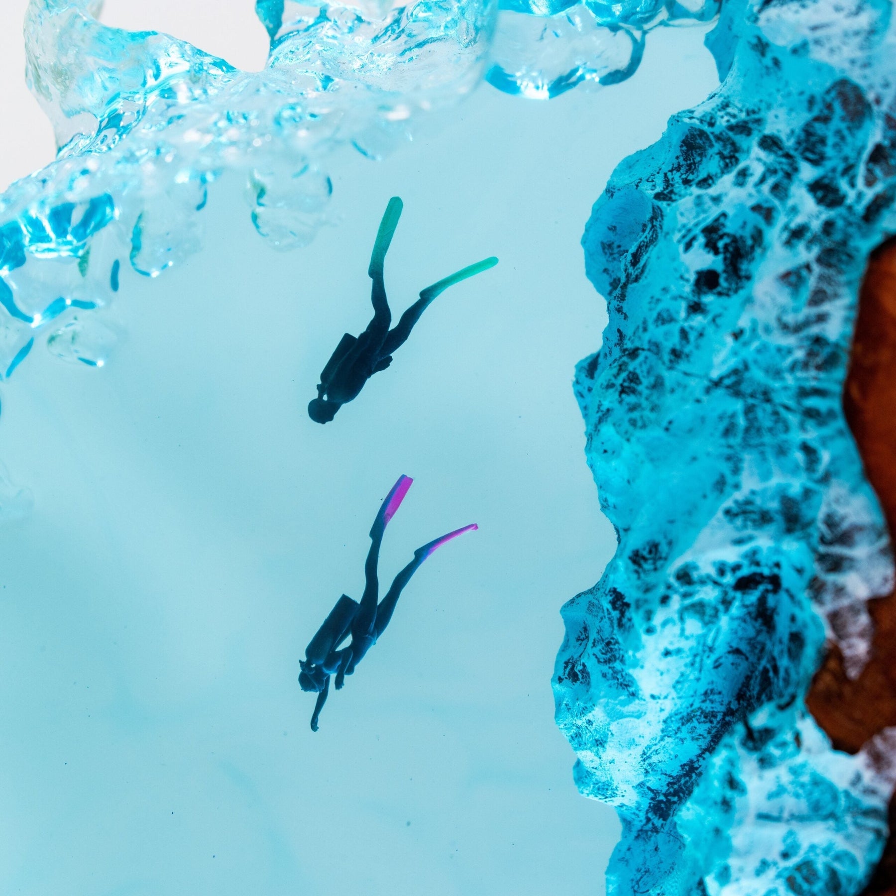 Imagine time halted, a diver encased in resin’s embrace—a symbol of courage in the face of the unknown.