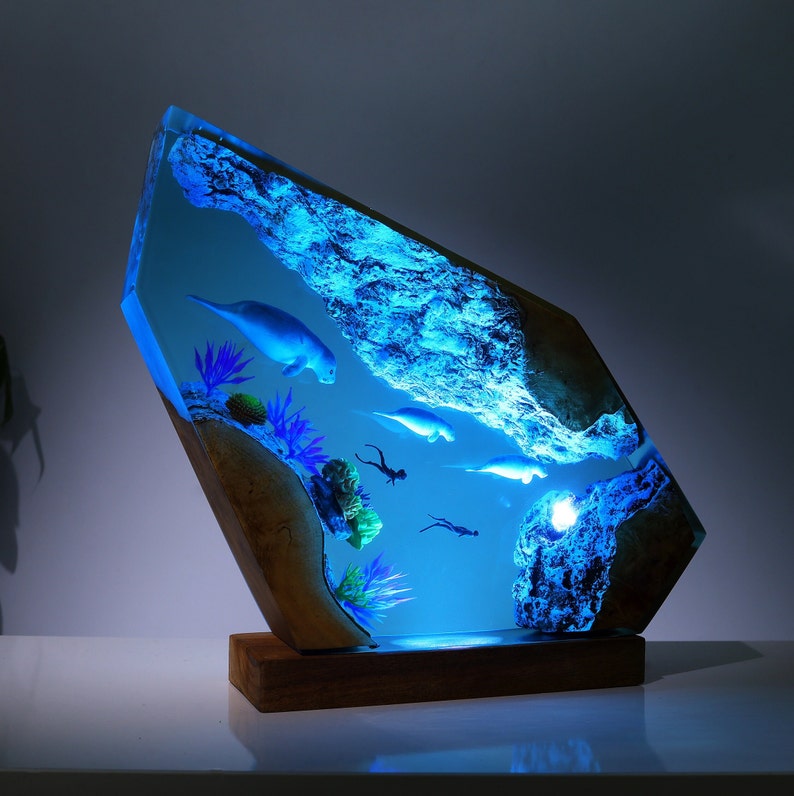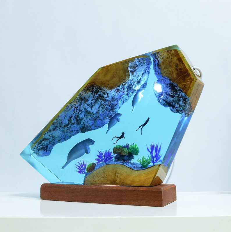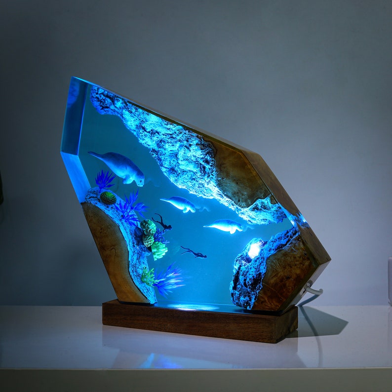 Introducing our extraordinary Resin Lamp with Seal and Diver—a harmonious blend of artistic craftsmanship and aquatic inspiration.